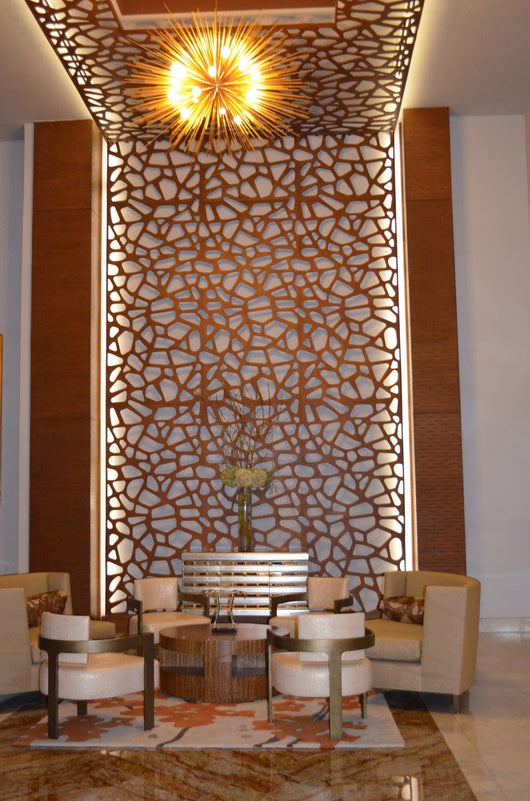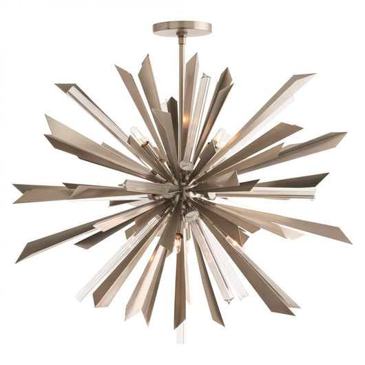 Depth and scale are transformative features in this eight-light chandelier. Angular steel shards in varying sizes extend from the center, creating a vibrant form finished in antique brass. Clear glass rods are interspersed throughout, adding a nice contrast from the metal. Available in a smaller size or vintage silver finish. Additional pipe available (PIPE-101). Approved for use in covered outdoor areas.