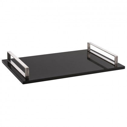 This black polished marble slab tray is balanced with vintage silver rail handles. A sleek solution to serving drinks, displaying collectibles or entertaining at parties. Food safe but use care as marble stains easily. Marble may vary.